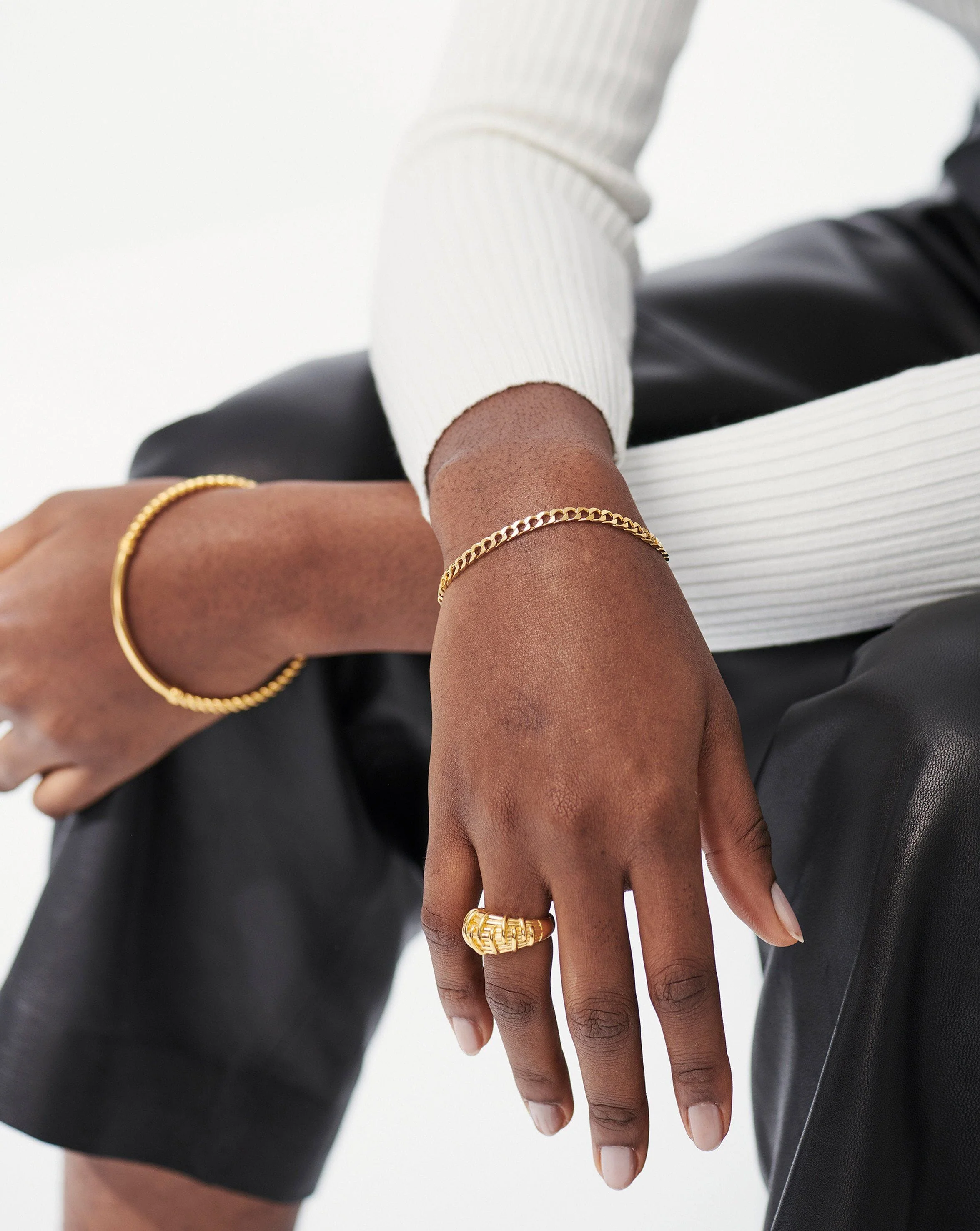 A delicate addition to your arm stack. This distinctive flat chain bracelet features squared-off links for a retro-inspired finish and fastens with a claw clasp. Layer with a snake chain for a more impactful look. Also available in the Lucy Williams Flat Curb Chain. Layer for less when bought as a set Iconic Lucy Williams Chain Bracelet Set.
